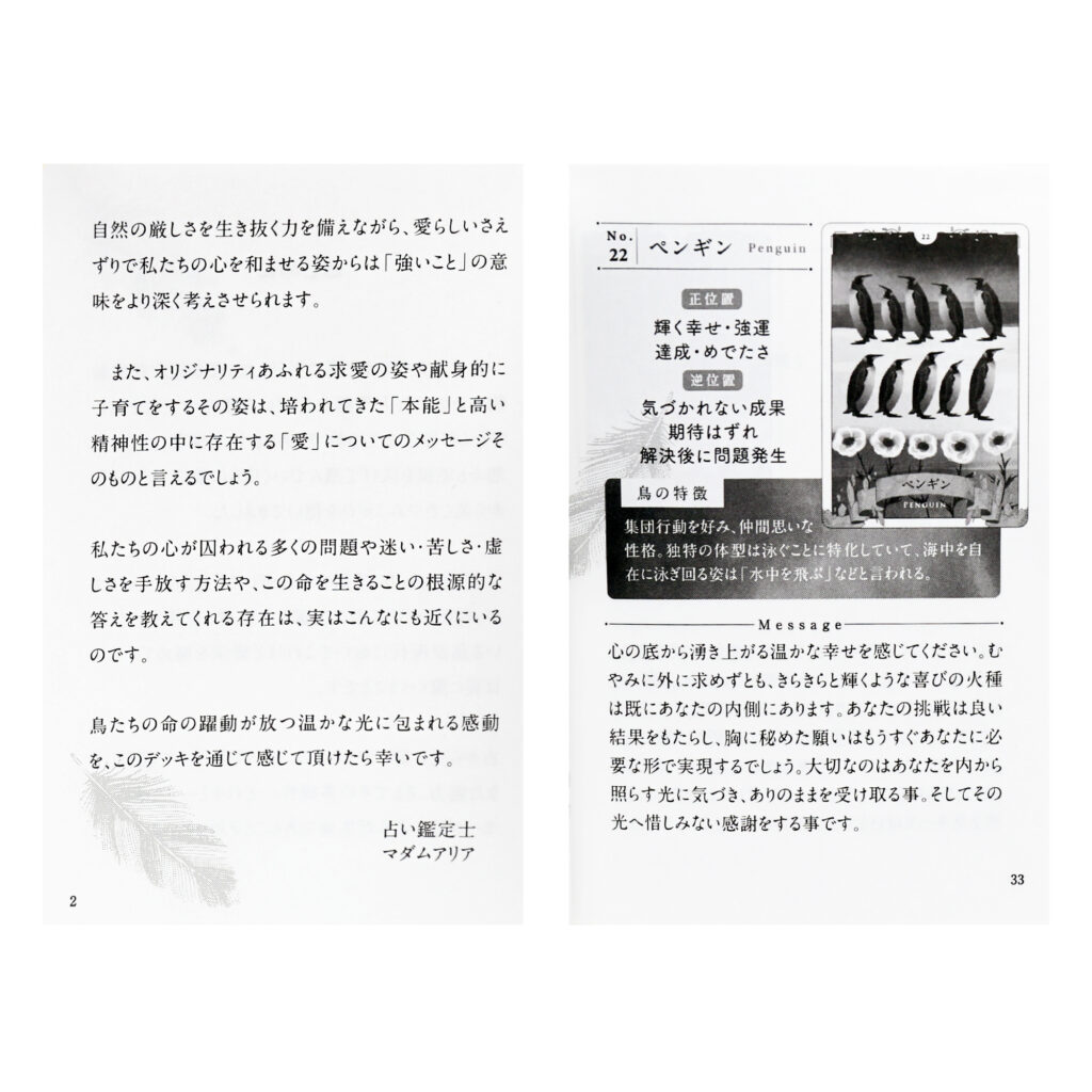 野鳥、身近な鳥、伝説上の鳥など豊富なバリエーション&示唆に富んだ絵柄は、リーディングしやすさと深いメッセージ性を兼ね備えています。